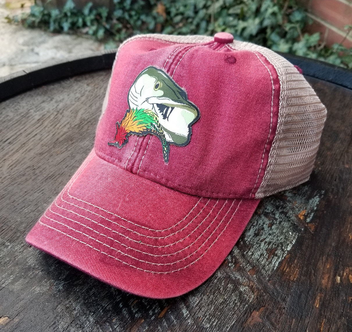Musky with Fly! woven patch on front. Creeknuts Logo woven patch on left side. Patches are iron-on.