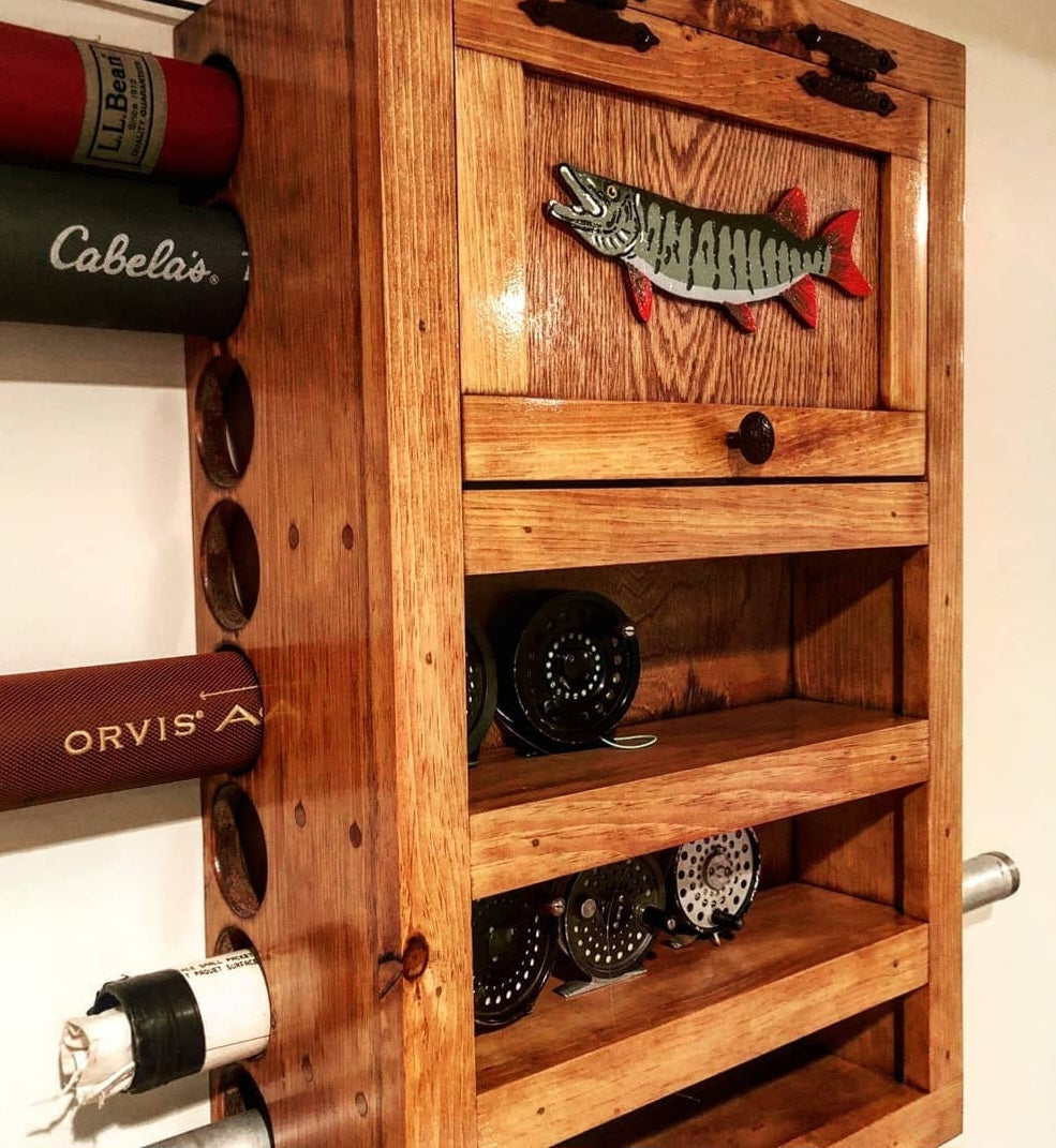 This Rod & Reel Cabinet is a wall-mounted storage unit for your rods, reels, and other fishing items. In addition to being practical, the rustic, but clean, look will be a welcome addition to the décor of your “fishing room!”